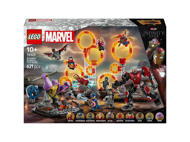 Az autentikus részletekben gazdag LEGO® | Marvel Bosszúállók: Végjáték a döntő csata (76323) megépíthető játékszett rengeteg ikonikus szuperhőssel vár, például Vasember és Fekete Párduc minifigurákkal, továbbá vagány funkciók és kiegészítők hívjáksoha véget nem érő, kreatív kalandokra azokat a 10 éves vagy nagyobb fiúkat és lányokat, akik imádják a szuperhősöket és az olyan játékokat, amelyeket megépíthetnek, kiállíthatnak és amelyekkel játszhatnak is.