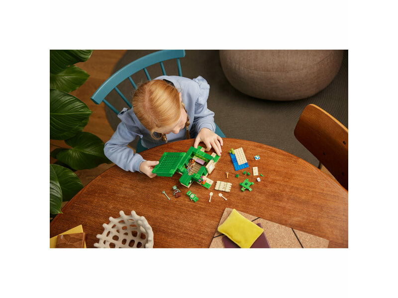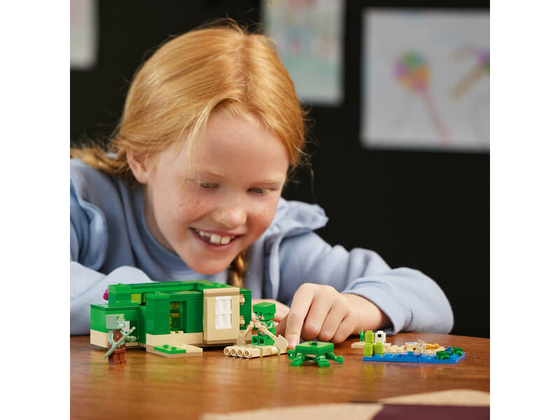 A Minecraft® teknős formájú modellház kívül-belül tele van Minecraft akcióval és állatos mókával. A 3 ikonikus szereplővel és szuper megépíthető struktúrával a LEGO® Minecraft® A tengerparti teknősház (21254) szett remek ajándékötlet a 8 éves vagy nagyobb gyerekeknek és Minecraft játékosoknak. A gyerekek megépíthetnek egy teknős formájú Minecraft házat ablakokkal, lámpásokkal, ajtóval, ággyal, asztallal, barkácsasztallal és kemencével. A levehető tető könnyű hozzáférést biztosít a belső részhez. Kint található egy tengerpart cukornáddal, teknős tojásokkal és evezős bambusztutajjal. Ismerős Minecraft figurákkal és mobokkal találkozhatsz: teknősharcos teknős skinben és sisakban, tengeri zombi szigonnyal, tengerifüvet legelésző teknős és 3 kisteknős. Más kiegészítők is a gamerek rendelkezésére állnak, mint például a látcső és a térkép. Azok, akik szeretik az akciódús videójátékokat, a kreatív építést és az állatgondozást imádni fogják ezt a sokoldalú játékot. Az extra digitális élményért a LEGO Builder appban az építők felnagyíthatják és 3D-ben elforgathatják a modelleket, és követhetik a haladásukat.