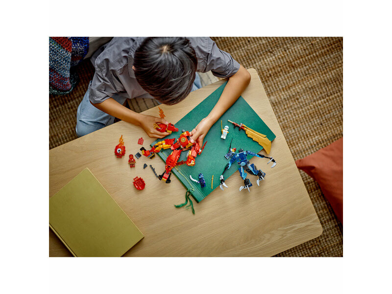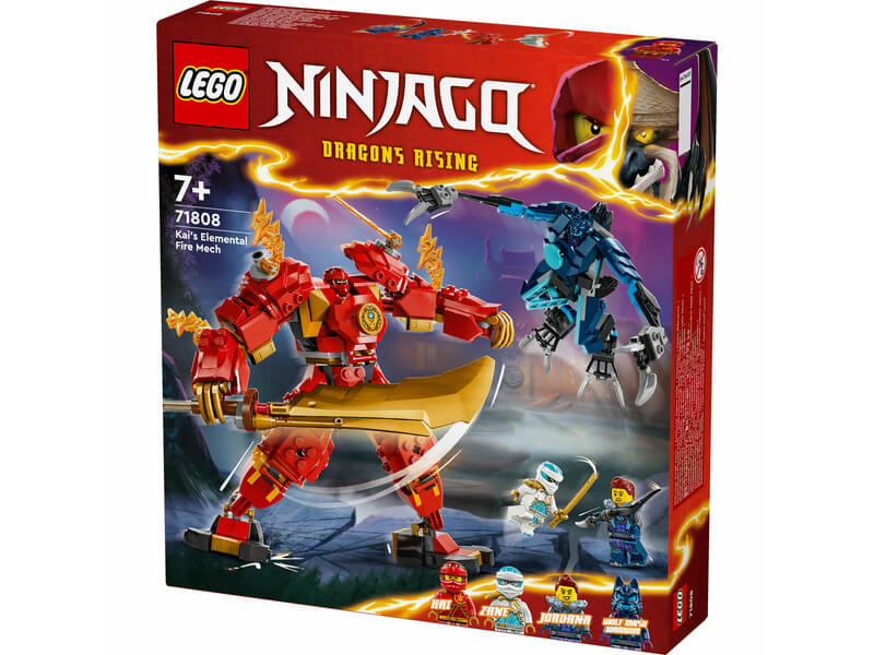 A 7 éves vagy annál nagyobb gyerekek újraalkothatják a NINJAGO® Sárkányok birodalma 2. évadának történeteit a Kai elemi tűzrobotja (71808) nindzsajátékkal. A robot karjai, lábai beállíthatók, így látványos csatapózokba lehet beállítani, emellett arobotnak van vezetőfülkéje a nindzsafigura számára és egy nagy, arany kardja, hogy csatajeleneteket lehessen eljátszani a farkas robotja ellen. Ez a testre szabható robot lehetővé teszi, hogy a gyerekek megépítsék a saját robotjukat! A leválasztható lá b, kar és törzs 2 másik robot részeivel kombinálható: Cole elemi földrobotja (71806) és Sora elemi csúcsrobotja (71807) (külön kaphatók). A gyerekek órákon át élvezhetik a szórakozást, miközben cserélgetik és összeillesztik a részeket, hogy egyediakciófigurát építsenek. A vörös robothoz 4 minifigura jár – Kai és Zane, mindketten katanával, Jordana egy karddal és egy Farkas álarcos harcos – így a gyerekek izgalmas nindzsaakciókat játszhatnak el. A készlet a LEGO® Builder app segítségével is megé píthető, amellyel egy könnyű és intuitív építési kalandban lesz részed neked és a gyerekeknek is.