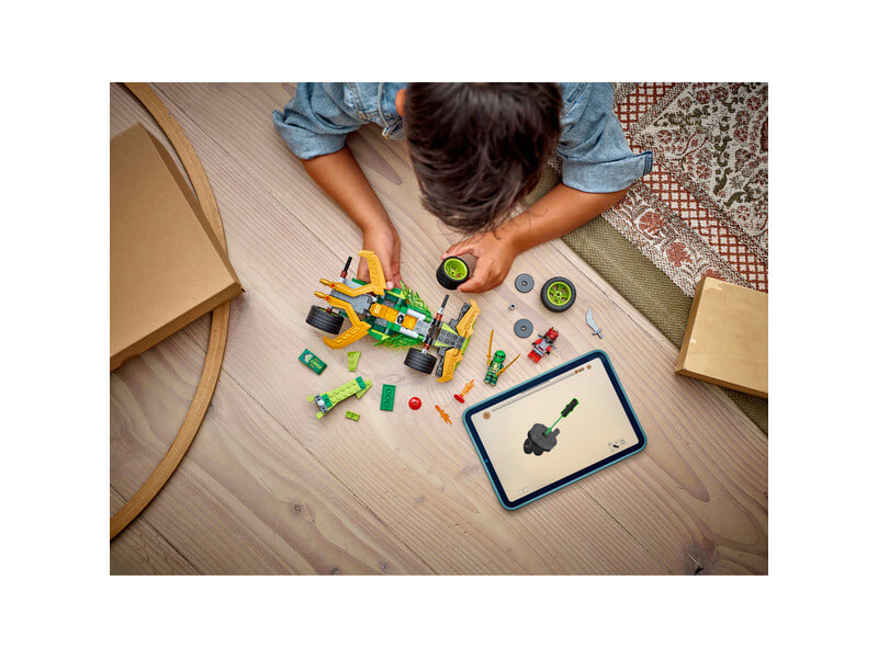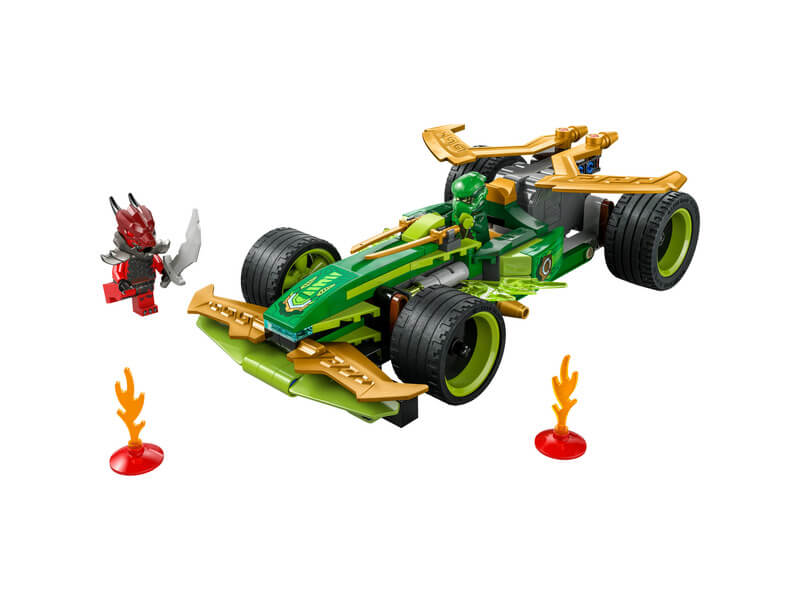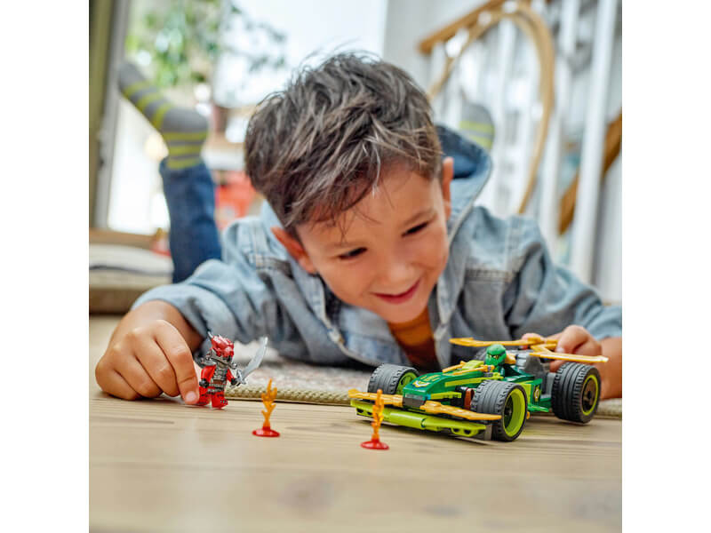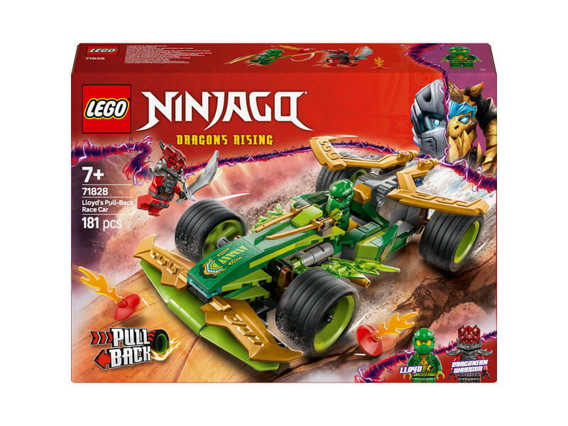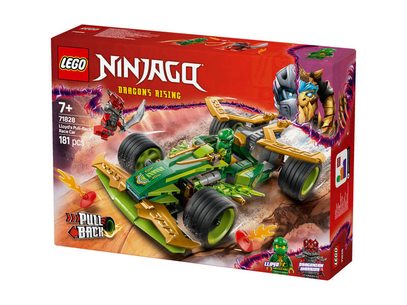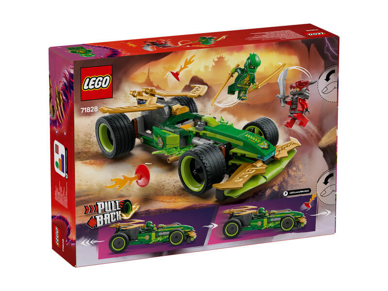 Örvendeztesd meg a kis nindzsádat a legeslegelső NINJAGO® hátrahúzhatós versenyautóval! A vagány versenyautónak 4 gumija van, vezetőülésébe egy minifigura ülhet, és világító, zöld villámalakú, pengék díszítik. A történetmesélős játékhoz 2 NINJAGO figura is tartozik: Lloyd 2 arany katanakiegészítővel, és egy gonosz dragoniai harcos kardkiegészítővel, hogy a gyerekek izgalmas csatákat játszhassanak el. Az építőszett 2 világító elemet is tartalmaz, hogy egy kis akadálypályát is készíthessenek a versenyautónak. A LEGO® NINJAGO megépíthető, gyerekeknek készült nindzsajátékainak választéka robotokat, sárkányokat és templomokat tartalmaz, így a rajongók eljátszhatják kedvenc akcióikat a nindzsahősökkel (a szettek külön kaphatók). A lenyűgöző nindzsás játékszettek megépíthetők a LEGO Builder app segítségével is.