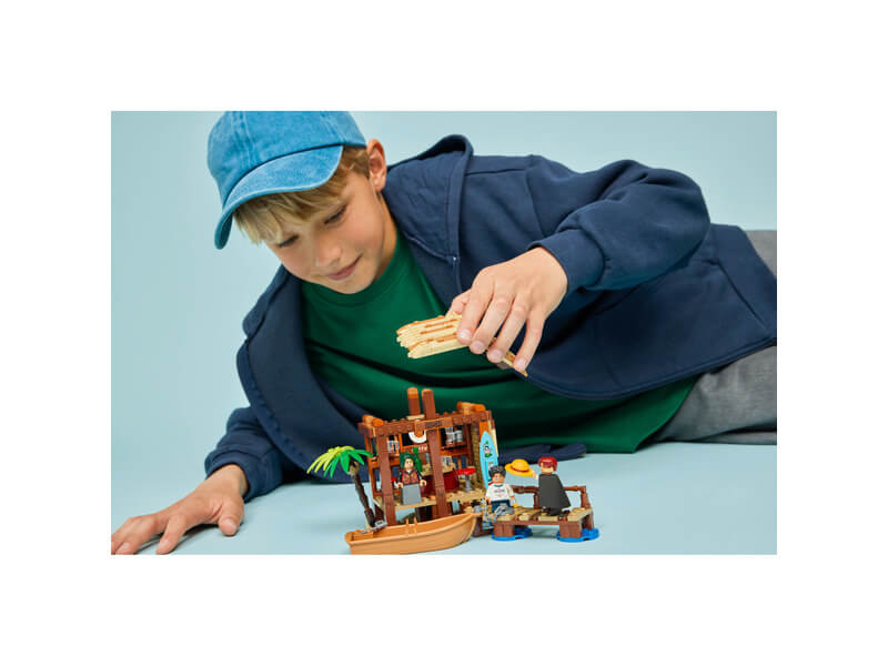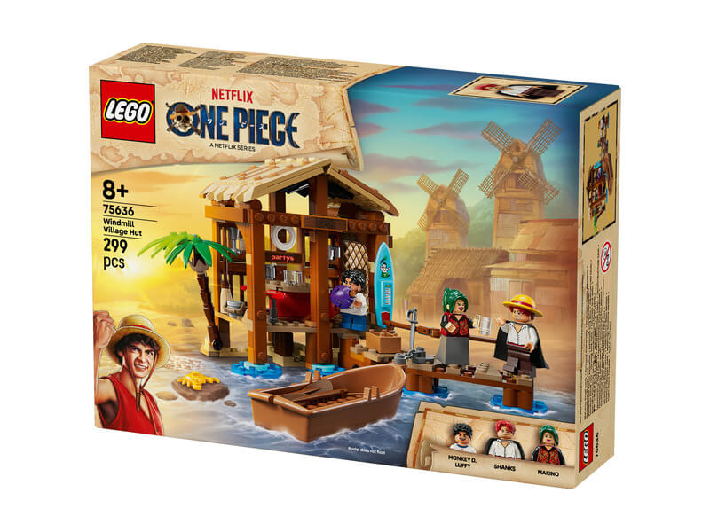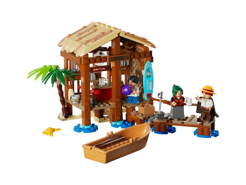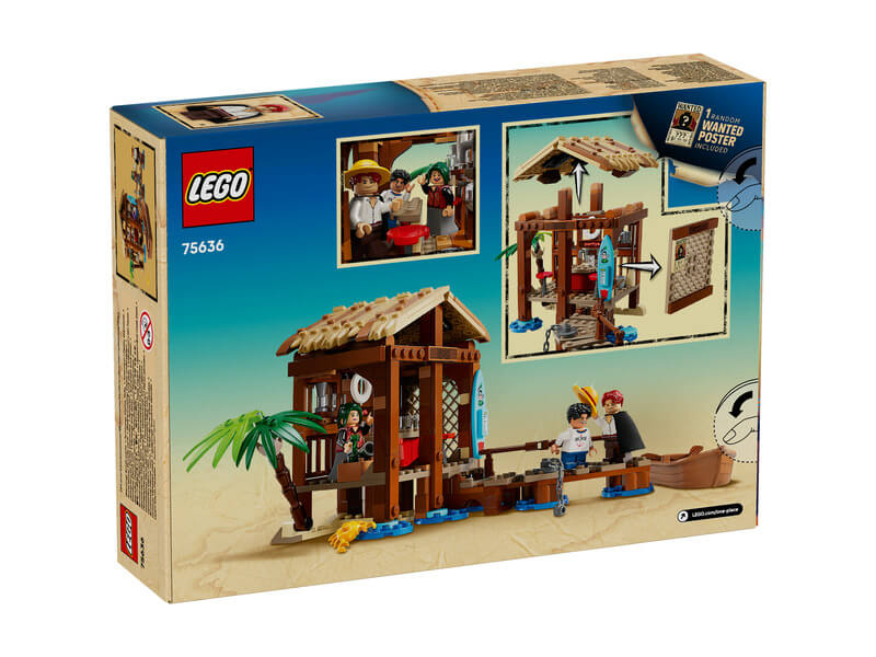 A gyerekek levehetik a tengerparti bolt tetejét, hogy hozzáférjenek a vidám meglepetésekkel teli belső részhez. Itt a bolt vezetéséhez és a vásárlók szórakoztatásához szükséges kiegészítőket találnak. A „Wanted” (körözött) feliratú posztert a falra lehet illeszteni, ahol a többi „Wanted” poszter számára is van hely – ezeket külön szerezheted be a többi LEGO® ONE PIECE modell megvásárlásával. Kint egy játék kalózhajó van lánccal a mólóhoz kötve. A készlet a Netflix-műsor 3 emlékezetes szereplőjének minifiguráit tartalmazza: Luffy, Shanks és Makino. Ha az építők egy kis digitális élményre is vágynak, akkor az intuitív LEGO Builder alkalmazásban felnagyíthatják, és 3D-ben elforgathatják a modelleket. A készlet 299 elemből áll.