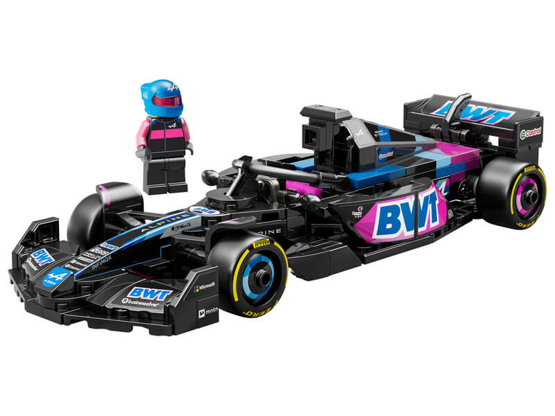 A F1 autómodell nyitható fülkével (a „glória” bukókeret felemelésével), hátsó szárnnyal, kereszt-lengőkaros felfüggesztéssel, szponzormatricákkal és „Pirelli” feliratú, szélesebb hátsó gumiabroncsokkal van ellátva. A játék versenyautóhoz tartozik egy pilóta minifigura, aki Alpine öltözéket és szárnyas sisakot visel, és akit a fülkébe is beültethetsz.