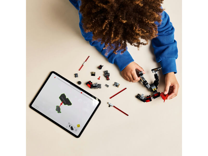 - Darth Maul LEGO® Star Wars™ minifigura – Ennek az ikonikus Star Wars szereplőnek a LEGO minifigura változatához tartozik egy dupla pengéjű, piros fénykard, amit a robot hátuljához lehet rögzíteni
