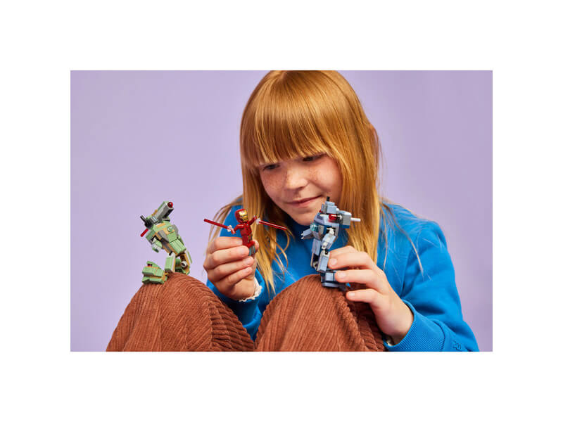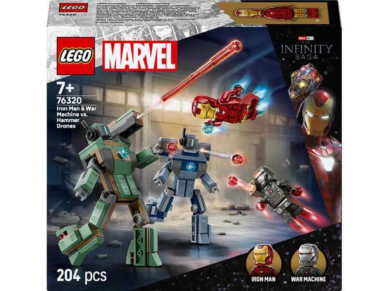 Ez a megépíthető játék megeleveníti a Vasember 2. című Marvel-film ikonikus csatajelenetét. A szetthez egy Vasember és egy Hadigép minifigura, valamint 2 megépíthető Hammer-drón tartozik. A Hammer-drónok teljesen csuklósak, így a gyerekek különféle pózokba állíthatják őket, hogy mozgalmassá tegyék a játékot. A zöld Hammer-drónnak korongvető van a vállán. A kék Hammer-drónnak pedig nyomós kilövő van mindkét vállán. Hadigép kezén és lábán piros sugárágyú, a vállán pedig egy korongvető van. Vasember kezén és lábán kék sugárágyút találsz, és lézersugár-elemeket tud megfogni. Az extra digitális élmény érdekében az építők felnagyíthatják és 3D-ben elforgathatják a modelleket, és követhetik a haladásukat az intuitív LEGO Builder appban. A készlet 204 elemből áll.
