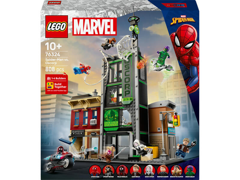 - Szuperhős minifigurák – A megépíthető szett 8 LEGO® minifigurát tartalmaz: Pókember, Póknő, Miles Morales, Eddie Brock, Szellempók, Norman Osborn, Kraven, a vadász és Zöld Manó