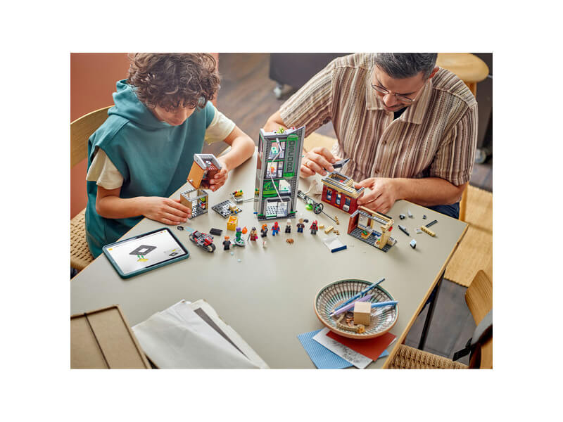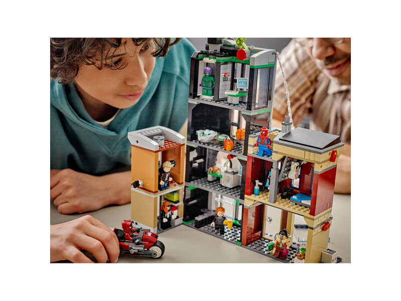 A városjelenet 3 különálló építményből áll: Miles Morales lakása (alatta ékszerbolttal), az Oscorp vállalat épülete és Venom lakása (alatta vegyesbolttal). Mindegyik szoba a megfelelő bútorokkal és kiegészítőkkel van berendezve. A végeláthatatlan hálóvető akciókat pedig a Marvel-filmekből ismert 8 LEGO minifigura biztosítja: Pókember, Póknő, Miles Morales a motorján, Eddie Brock, Szellempók, Norman Osborn, Kraven, a vadász és Zöld Manó a siklóján. Az átlátszó pálcákkal a gyerekek könnyedén elhelyezhetik és különféle valósághű pozíciókba állíthatják a figurákat. Építsetek együtt a LEGO Builder alkalmazással, ahol osztozhatsz a kreatív szórakozásban a családoddal és a barátaiddal. A szett 808 elemből áll.