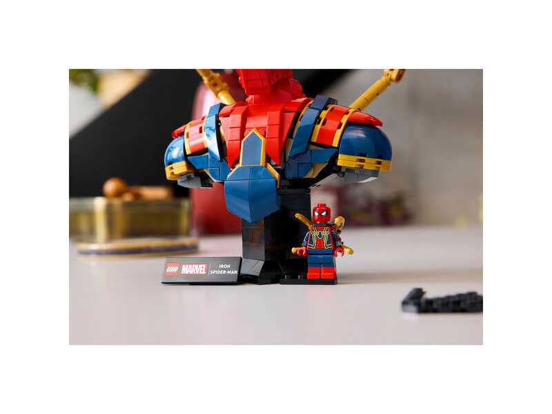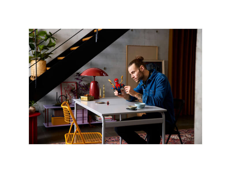 - Valósághű részletekben gazdag – A közkedvelt Marvel-szereplő valósághű modelljének forgatható a feje, és tartozik hozzá egy LEGO® Vas Pókember minifigura