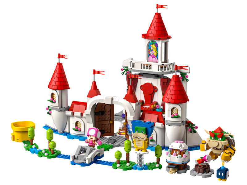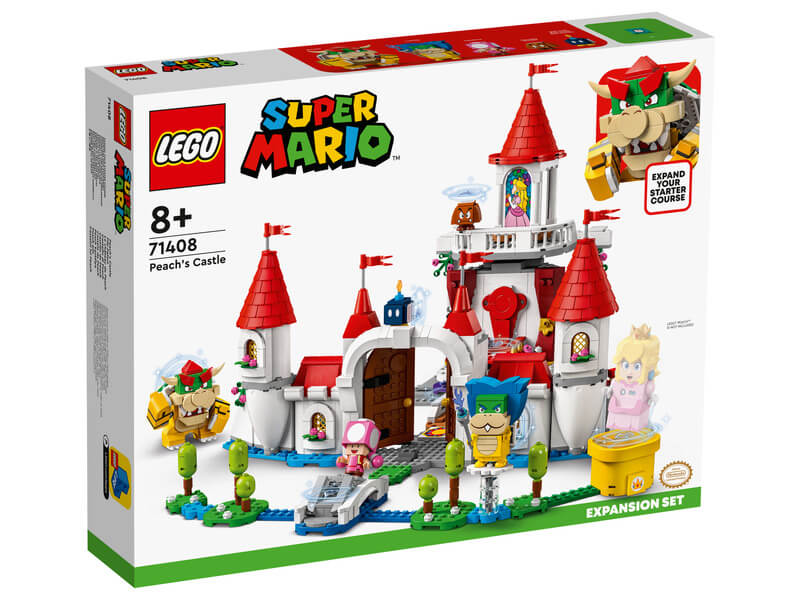 A Peach kastélya kiegészítő szettel (71408) a gyerekek egy ikonikus helyszínnel egészíthetik ki LEGO® Super Mario™ univerzumukat. A játékosokra rengeteg felfedeznivaló vár, emellett interaktív LEGO® Mario™, LEGO® Luigi™ vagy LEGO® Peach™ figurájukkal (a szett nem tartalmazza) számos módon nyerhetnek digitális érméket. A készlet egy tróntermet tartalmaz forgatható fallal, ami Bowsert rejti, emellett egy Peach-et ábrázoló ablaküveget, egy interaktív elemmel ellátott Bob-omb festményt, egy Goombát rejtő tortát, egy Peach kastélya különleges csövet, Időkockát, „leszakadt” hidat, egy lila gyümölcsöt tartalmazó gyümölcstálat és sok minden mást is találsz. (Megjegyzés: a 71360, 71387 vagy 71403 kezdőpálya szükséges az interaktív játékhoz.)