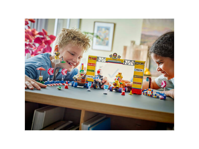 Vigyázz, kész, építés! Hadd készítsék el a gyerekek saját Mario Kart™ pályájukat és járműveiket, hogy versenyezhessenek a győzelemért és ikonikus szereplők bőrébe bújhassanak ezzel a LEGO® Super Mario™: Mario Kart™ – Baby Peach és a Grand Prix szettel (72036). Egy remek, Nintendo®-figurás ajándékötlet 8 éves vagy annál nagyobb fiúknak, lányoknak és gamereknek, hiszen ebben a testre szabható, versenyzős játékszettben megtalálják a kilövővel felszerel Wild Wiggler, Landship és Standard Bike járműveket, de a készlet része még a kezdőkapu, az akadályok, a bóják, a dobogó, Toad édességeket rejtő kocsija és Lakitu felhője is.