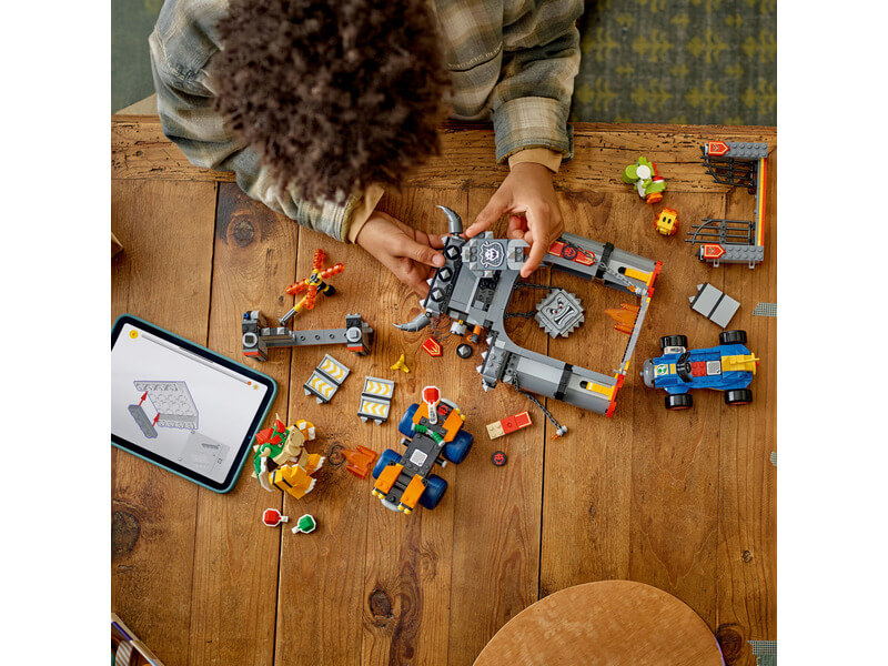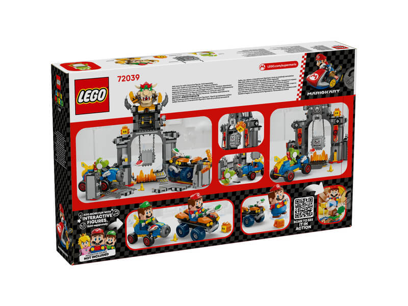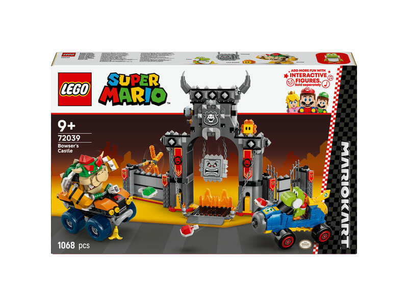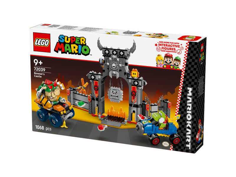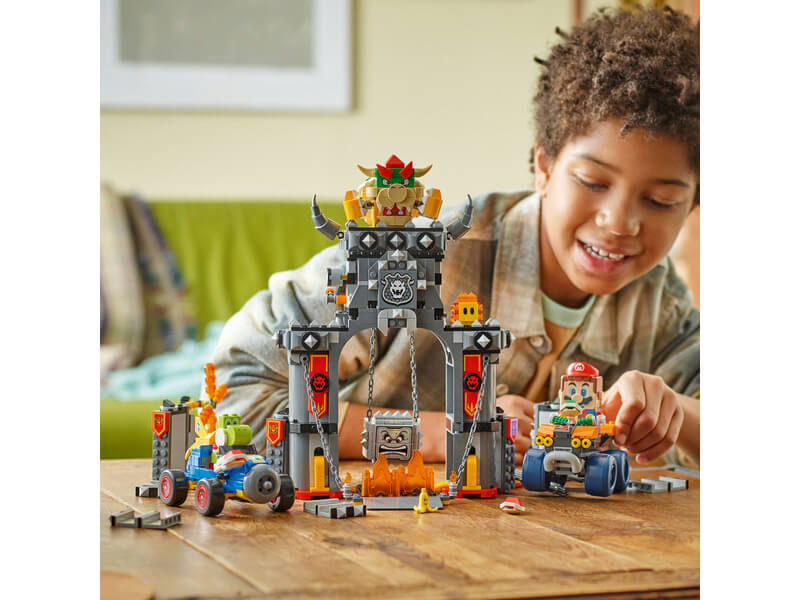 - Bowser kastélya – Versenyeztesd Bowsert és Yoshit, törd át a kastély falait, és kerüld ki a lezuhanó Thwompot ebben a gyerekeknek készült, játék járművet tartalmazó LEGO® Super Mario™: Mario Kart™ játékkészletben!