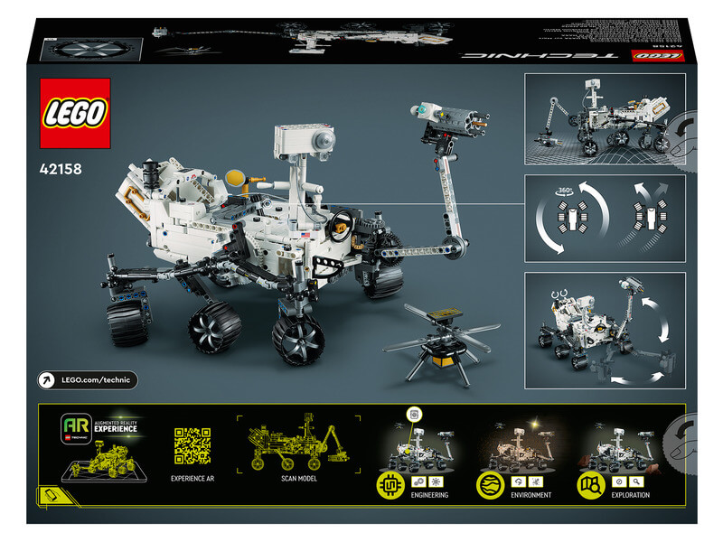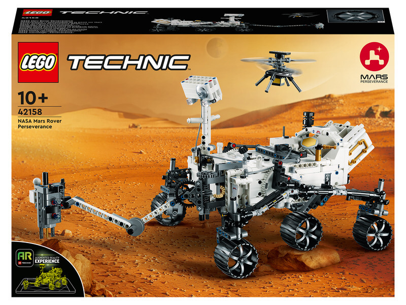 Készen állsz egy küldetésre a Marson? Ideje megépíteni a NASA Mars Rover Perseverance replikamodelljét és a kísérő Ingenuity helikoptert. Nézd meg a csuklós felfüggesztést, amivel a marsjáró mind a 6 kerekével át tud hajtani az egyenetlen felületeken. Próbáld ki a haladó szintű, 2 módú kormányzást, és mozgasd a marsjáró karját! Fedezd fel a távolabbi területeket is az AR appban, ahol érdekességeket tudhatsz meg a Marsról, a marsjáróról és a küldetéséről.