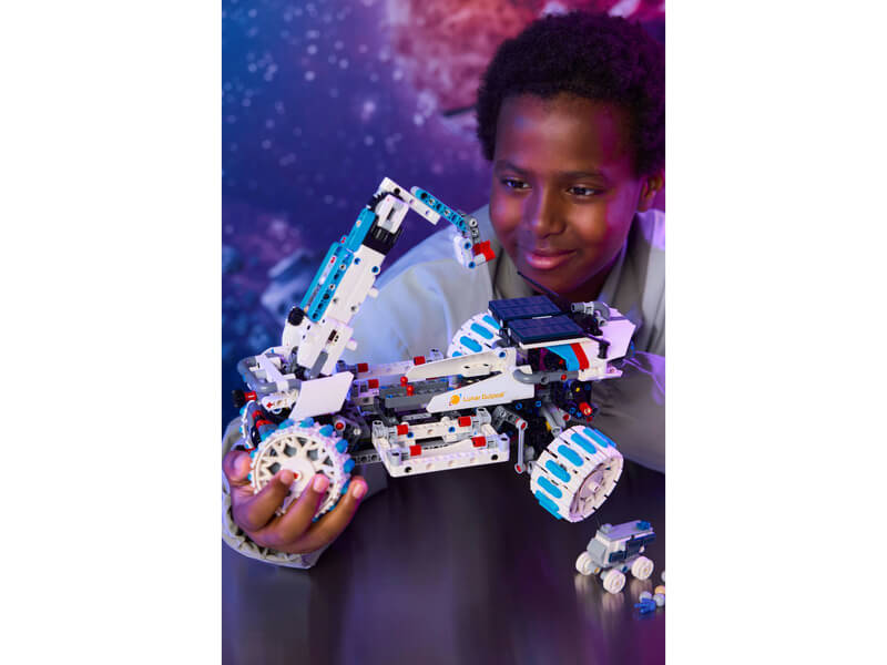 - Többféle jármű és funkció – A készlet tartalmaz egy holdjáró terepjárót, amely lengőfelfüggesztéssel, négykerék-kormányzással és telepíthető napelemekkel van felszerelve, valamint egy kisebb bányászgépet, egy mintatárolót és egy MAPP-holdjárót
