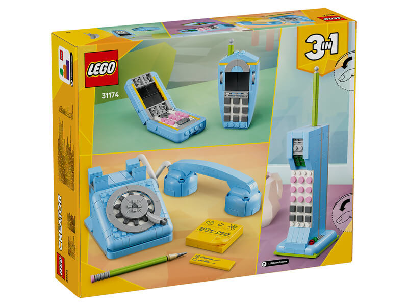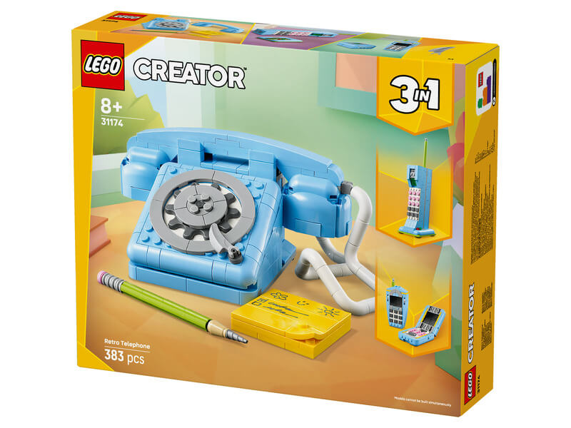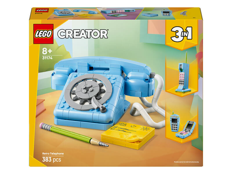 A nosztalgiára vágyó felnőtteket és a 8 éves vagy nagyobb, kreatív gyerekeket visszarepíti az időben a stílusos LEGO® Creator 3 az 1-ben Retró telefon (31174) építőkészlet. A szett tartalmaz egy vagány és retró stílusú játék telefont az 1960-as évekből, amelynek felemelhető a kagylója, rugalmas a zsinórja, elforgatható a tárcsázója, és visszaugrik a helyére, amikor a hívó leteszi a telefont. Ehhez a dekorációs retró szetthez tartozik egy kockákból épült ceruza és egy testre szabható jegyzetfüzet is: 3 különböző színű lapocskát használhatsz a különféle üzenetekhez. Ez a csodálatos LEGO szett 3 különböző építési lehetőséget kínál ugyanazokból a kockákból: egy retró stílusú játék telefont az 1960-as évekből, egy töltőre helyezett játék telefon az 1980-as évekből és 2 vagány telefont a 2000-es évekből. A LEGO Creator 3 az 1-ben készletek remek ajándékok a gyerekeknek, hiszen egy szett 3 különböző építési lehetőséggel várja őket. Az átépíthető, 3 az 1-ben játékszettek örömteli és fantáziadús játékot nyújtanak, a széles választék pedig lehetővé teszi, hogy a gyerekek a legfőbb szenvedélyeiknek hódoljanak. Fontos, hogy a modelleket csak külön-külön lehet megépíteni! A szett 383 elemből áll.