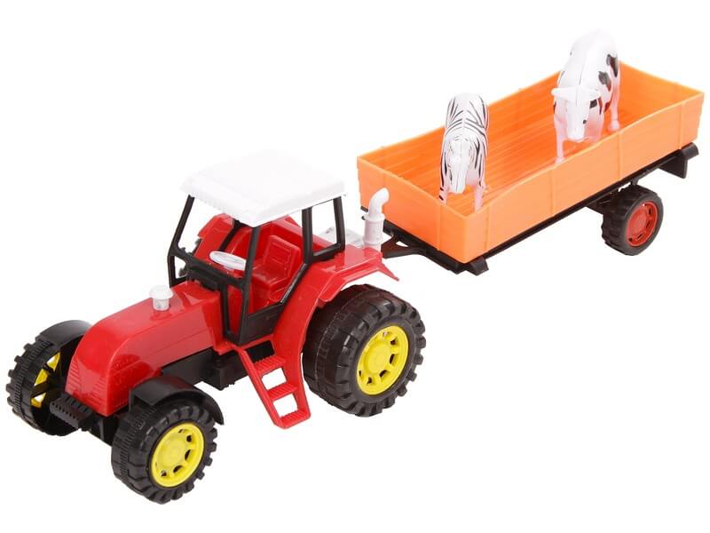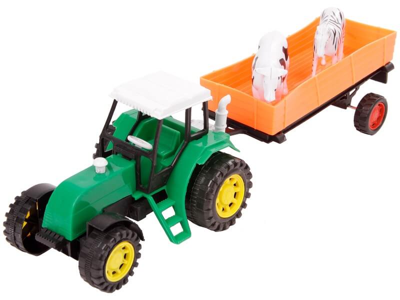 Szállíts állatokat a lendkerekes traktor utánfutóján! A Lendkerekes traktor állatszállító utánfutóval készlet egy nagyobb traktort tartalmaz sofőrrel, és lecsatlakoztatható utánfutóval. Az utánfutón egy bikát és egy zebrát találsz, akiket el tudsz vinni az állatkertbe. A traktor lendkerekes, ha megtolod, magától tovább fog gurulni. Traktor méretei: 15 x 10 x 8 cm. Szerelvény hossza: 30 cm. A traktor színe eltérhet a képen láthatótól.