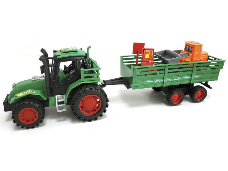 Szállíts el egy miniatűr munkagépet a lendkerekes traktor utánfutóján! A Lendkerekes traktor munkagépszállító utánfutóval készlet egy nagyobb traktort tartalmaz sofőrrel, és lecsatlakoztatható utánfutóval. Az utánfutón két táblát és egy mini markolót találsz, amit könnyen elszállítmányozhatsz. A traktor lendkerekes, ha megtolod, magától tovább fog gurulni. Traktor méretei: 15 x 10 x 8 cm. Szerelvény hossza: 30 cm. A traktor színe eltérhet a képen láthatótól.