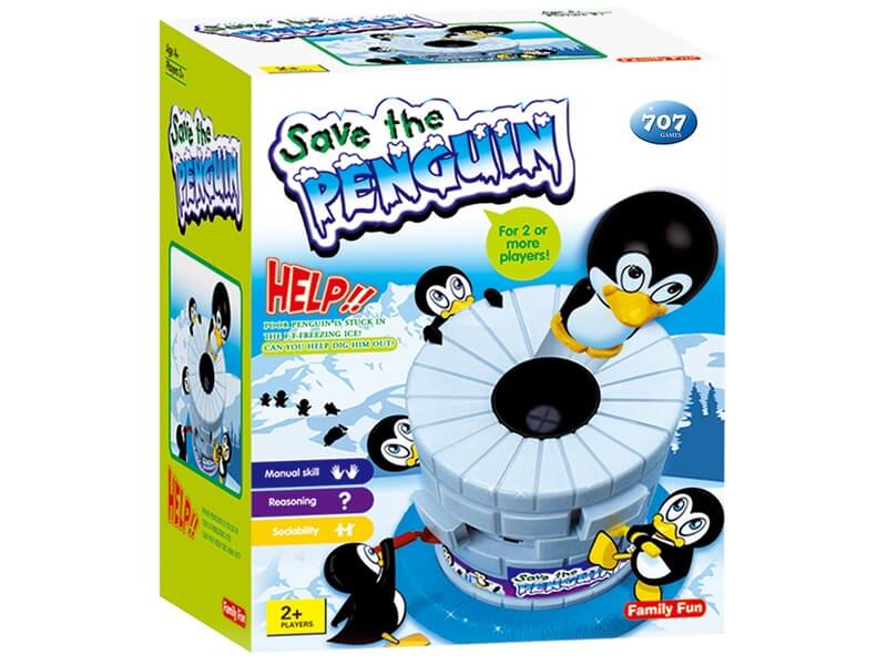 A pingvin beszorult a jég csapdájába! Mentsd ki onnan! A Mentsd meg a pingvint társasjátékban a játékosok kanalakkal szedik ki a jégtömböket. Csak egy tartja a pingvint, és az a sikeres játékos, aki a megfelelő jégtömböt szedi ki, megnyeri a játékot! A helyes választást a pingvin figura felugrással jelzi, a Mentsd meg a pingvint társasjáték fejleszti a finommotoros mozgást, és az ok-okozati összefüggések megértését! A társasjáték tartalma: 1 db pingvin figura, 1 db jégtömb kivehető darabokkal, 4 db kanál, játékszabály.