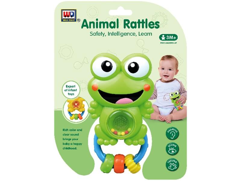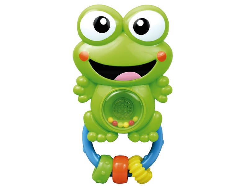 Pici, műanyag csörgő vigyorgó béka figurával! A Műanyag békás csörgő egy zörgő golyókkal töltött kis béka, akit fel lehet akasztani a babaágyra, babakocsira is. Ha a pici megrázza a békát, akkor az vidám, zörgő hangot ad ki magából. A műanyag békás csörgő játék közben világít, pocakja piros fényt ad ki magából. A játék 4 db LR44 gombelemmel működik, a csomagolás az elemeket nem tartalmazza. Méretek: 8 x 14 x 3 cm.