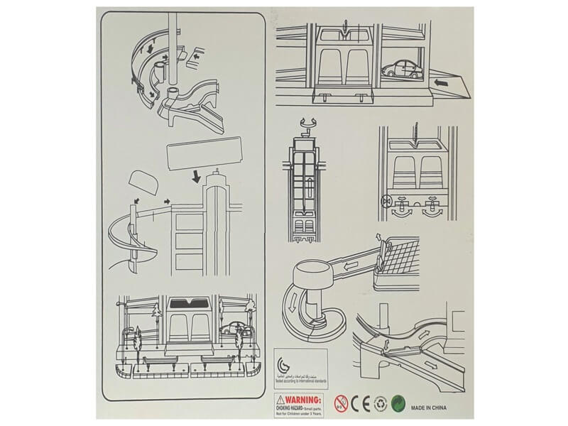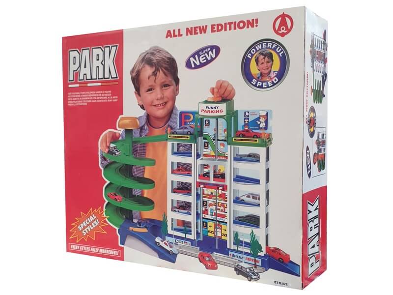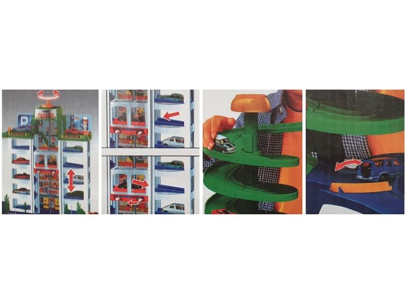 Tárold kisautóidat egy magas, luxus parkolóházban! Az Ötemeletes parkolóház egy nagy garázs, lifttel és spirális kihajtóval felszerelve. Az autókat az emeleteken tudod tárolni, az autókat a tekerős felvonóval tudod a megfelelő szintre juttatni. Ha ki szeretnél állni valamelyik kocsival, csak lökd a felvonóra, majd irány a legfelső emelet! A spirális rámpán az autó magától le tud gurulni, és már indulhat is a sofőr a dolgára! Az Ötemeletes parkolóház készlet kisautót nem tartalmaz. Csomagolás méretei: 40 x 11 x 35 cm.