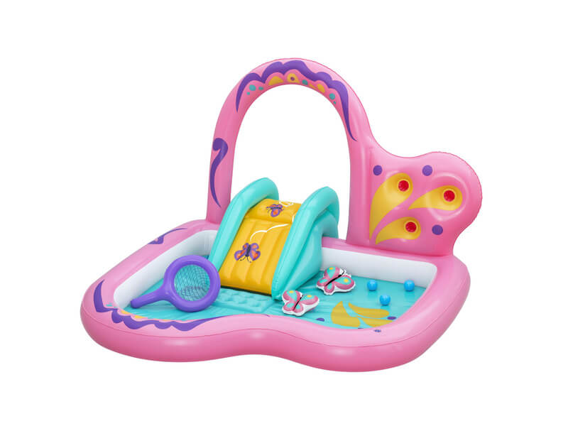 A játékközpontban van csúszda, ami a medence aljához rögzített, és a végén puha érkezőpárna segít a kényelmes leérkezésben. Emellett külön móka a labdasortírozó fal (3 labdával), és az inflálható pillangóháló is, amivel a mellékelt pillangó figurákat lehet “elkapni”. A nap végén a leeresztő szelep megkönnyíti azt.  Méret: 180 x 180 x 117 cm  Tartozékok: medence, felfújható háló, 2 pillangó, 3 labda, javítófolt