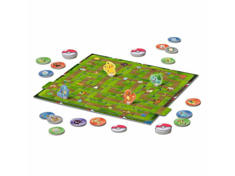 A doboz tartalma: 1 játéktábla, 4 Pokémon karakter, 4 karaktertartó láb, 34 labirintustábla, 24 Pokélabda korong.