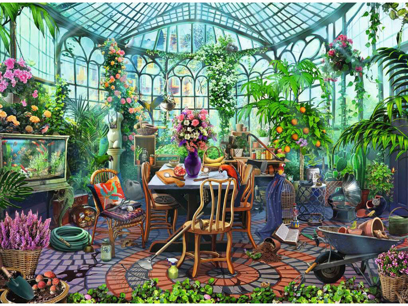 - Gyönyörű illusztráció: A puzzle egy csodás reggeli jelenetet ábrázol az üvegházban, tele színes virágokkal és zöld növényekkel, amely a természet szépségét tükrözi.