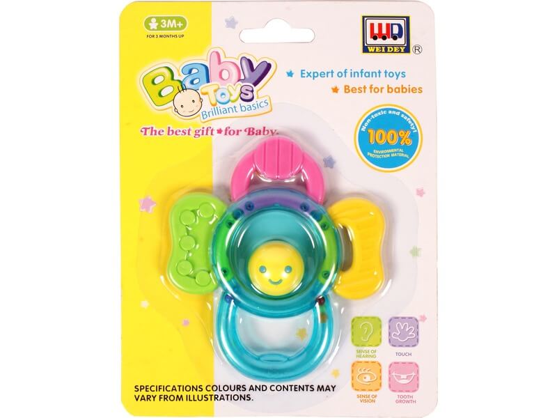 Rázd és rágcsáld a kis állatkát! A Rágókás műanyag csörgő egy kétfunkciós bébijáték, ami fejleszti a baba érzékszerveit! A csörgő színes golyókkal van töltve, amik csörgő-zörgő hangot adnak ki magukból. A csörgő két szárnya lapos műanyagból készült, és miközben rágcsálja a pici, csillapodik a növekedő fogak kellemetlen érzése. A Rágókás műanyag csörgő babakocsira, kiságyra is felfogatható. Méretek: 9 x 11 cm.