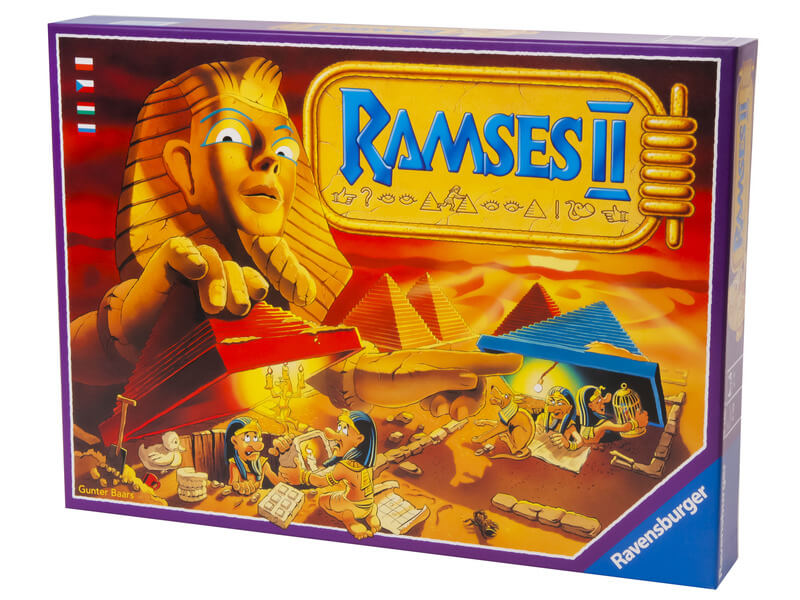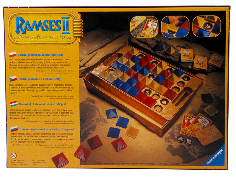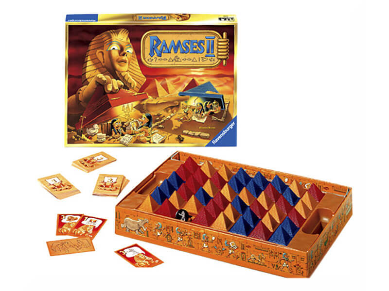 Ramszesz fáraó melyik piramisok alá rejtette kincseit? Keress, kutass és találj! A Ramses II társasjátékban 47 piramis közül valamelyikek alatt kincsek lapulnak. A kincskereső játékosoknak a fáraónak kell segíteni, hogy eszébe juttassák, hova rejtette az értékeit. Nyissatok utakat, tologassátok a piramisokat mind a négy irányba, és találjátok meg az összes kincset, amik a játékkártyákon szerepelnek! Ramszesz fáraó örökségére az a játékos lesz méltó, aki a legtöbb kincset felfedi!