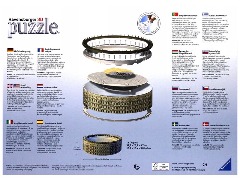 Róma ékessége, az ókori aréna pontos mása puzzle darabokból! A római Colosseum egy hatalmas kiterjedésű kőépület, ahol a legtöbb hivatalos eseményt tartották a rómaiaknak. A Kolosszeumban küzdöttek a gladiátorok is! A mozaikdarabok erősen kapcsolódnak egymáshoz, ragasztó nélkül össze tudod állítani az épületet. A római Colosseum 260 darabos 3D puzzle kirakott méretei: 32 x 26 x 10 cm.