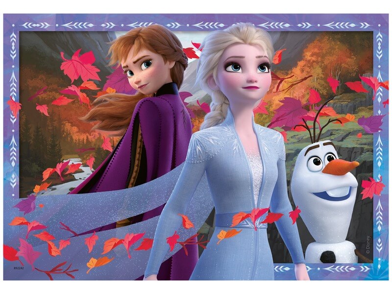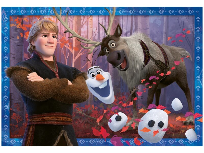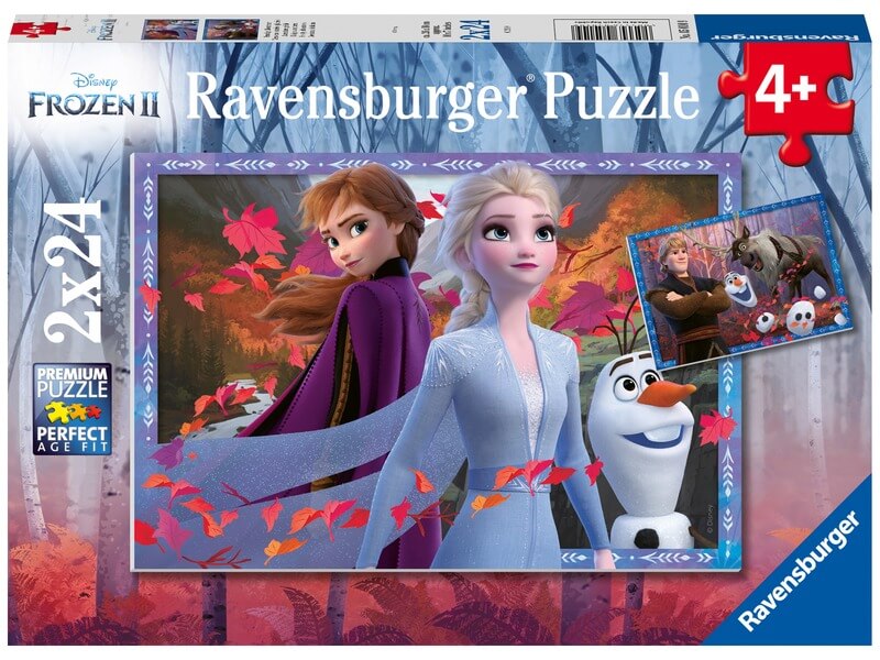 A Jégvarázs 2 rajzfilm főszereplői, egyszerre két képen! A Jégvarázs 2 Az erdőben 2 x 24 darabos puzzle Anna, Elsa hercegnőket, Kristoff herceget, Olafot és Sven-t ábrázolják, kirkakósként. A puzzle könnyen illeszthető mozaikdarabokból készült, a két képpel a gyerekek akár versenyezni is tudnak, ki a gyorsabb. A Jégvarázs 2 Az erdőben 2 x 24 darabos puzzle kirakott mérete: 26 x 18 cm.