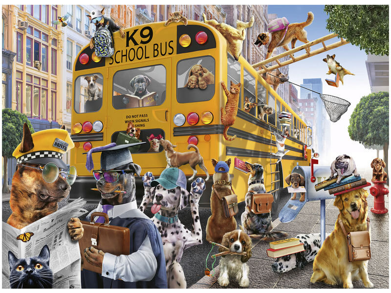 Amikor az állatok is iskolába szeretnének járni, akkor előfordul, hogy ilyen szürreális kép születik, ahol a németjuhász az iskolabusz vezetője, a dalmata kisdiák, vagy éppen egy cica figyeli az eseményeket a sok kutya közé keveredve. Teljes a felfordulás.