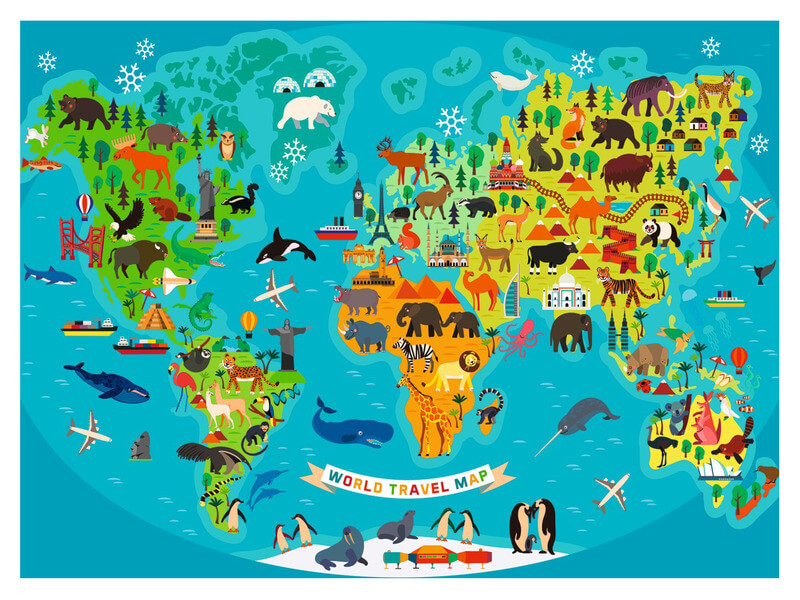 Szórakoztató és informatív puzzle megrajzolt világtérképpel. Ismerje fel az állatokat, és tanulja meg, hol élnek a világ minden táján!