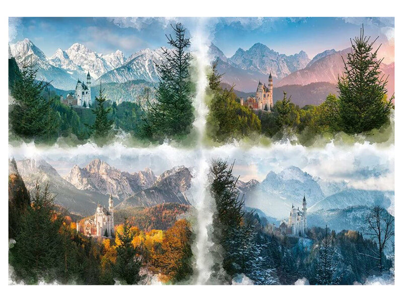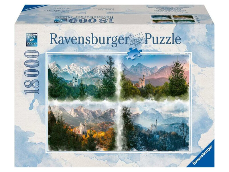 A Ravensburger kiváló minőségű termékei mögött több évtizedes puzzle-gyártási tapasztalat áll, mely garantálja a felejthetetlen puzzle-élményt. A minőség iránti szenvedély, a részletekre való odafigyelés és a motívumok hatalmas választéka teszi a Ravensburger kirakókat olyan egyedivé. Kínálatában kezdőktől a profikig mindenki megtalálja a számára tökéletes puzzle-t! A Neuschwanstein kastély – Négy évszak című képen láthatjuk, hogy a világhírű német kastély látványa miként változik a különböző évszakok színeiben. A 200 méter magas sziklagerincen álló középkori lovagvárhoz ma évente több, mint egymillió turista látogat. Kirakott kép mérete : 276 cm x 192 cm.