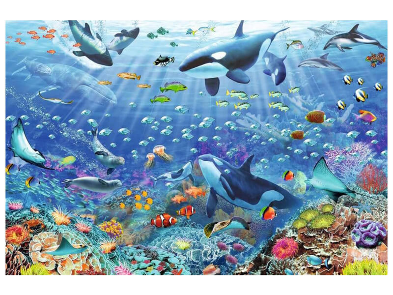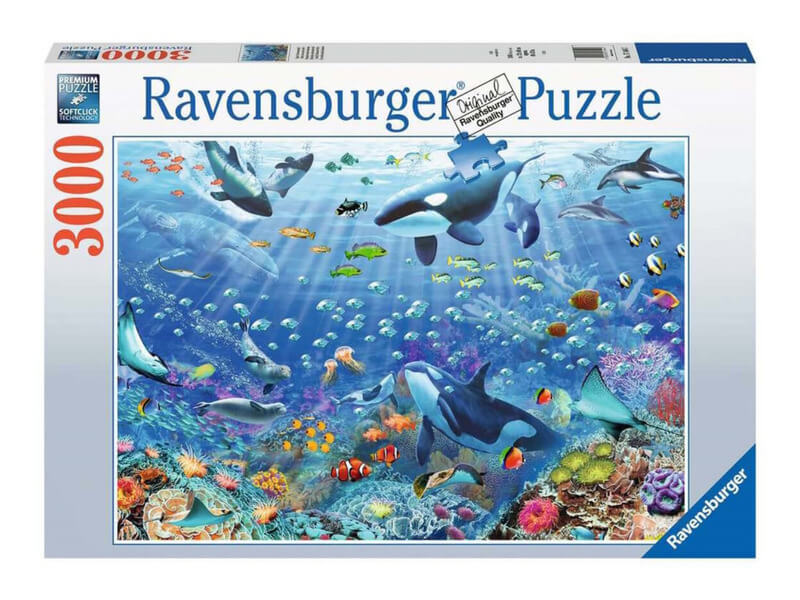 A Ravensburger 3000 db-os puzzle – Színes víz alatti világ című képen egy csodálatos vízi világ tárul a szemünk elé.