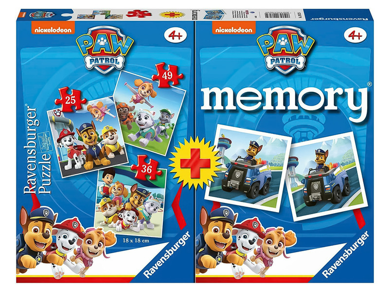 A doboz tartalma: 3 db puzzle (25, 36 és 49 db-os) és egy memóriajáték – 24 pár kártyával -, a közkedvelt és híres Mancs őrjárat animációs mese szereplőivel illusztrálva. A kirakott képek mérete: 18 x 18 cm. Ezek a játékok fejlesztik a memóriát, a megfigyelő képességet és a koncentrációt, megszínesítik a játékidőt!