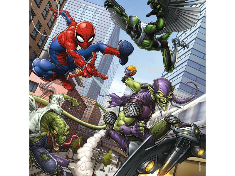 Ez a 3 dinamikus képből álló készlet a Pókembert mutatja be akció közben, amint megpróbálja leküzdeni az összes gonosz ellenséget, a szupererős kölyök arachnidot, a zöld koboldot, a keselyűt és a gyíkot. 3 x 49 darabos gyerekrejtvényünk prémium minőségben készült, és 17,8 x 17,8 cm-es, amikor elkészült. Remek rejtvények 5 éves kortól. Tökéletes játékok gyermeke számára – A rejtvények minden életkorú gyerekeknek segítik a gyermek fejlődését játék közben, fejlesztik a koncentrációt és a kreativitást.