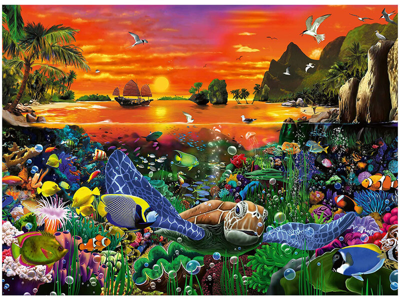 Mesésen csodálatos kép a korallzátonyok gazdag élővilágáról, középpontban egy kedves teknőssel, aki békésen úszkál tengeri társai között.
