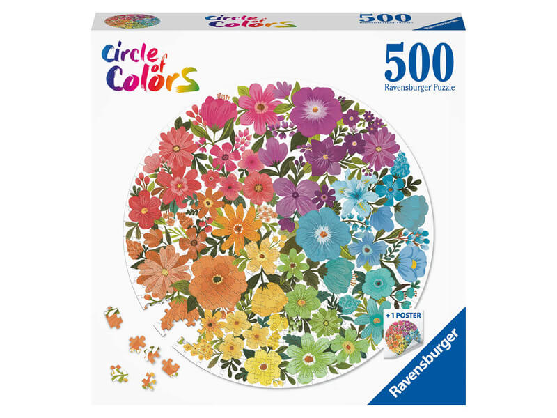 A Ravensburger 500 db-os kör puzzle – Virágok kirakón gyönyörű színes növényeket láthatunk.