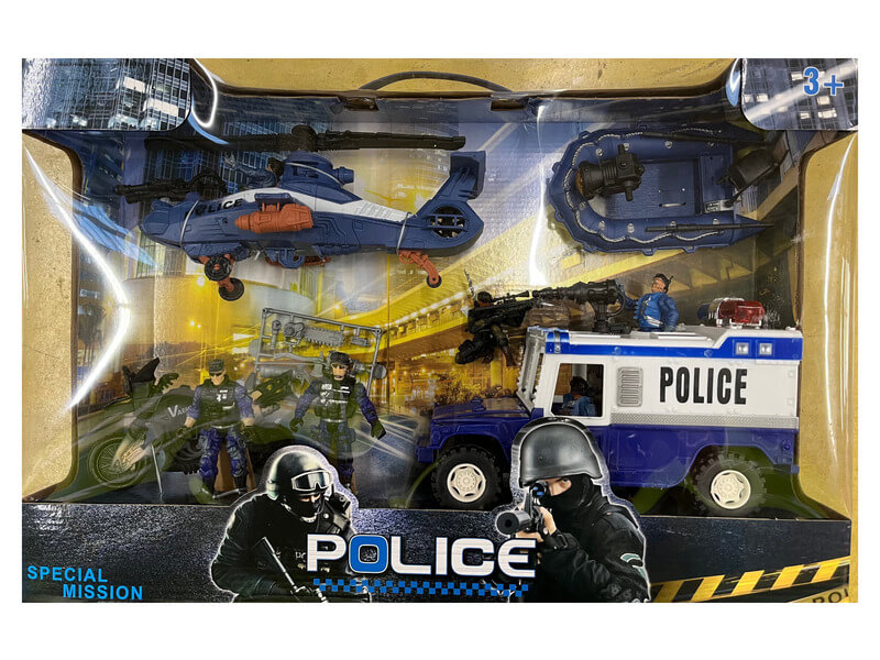 Vesd be saját rendőreid bármilyen vészhelyzetben! A Rendőrségi jármű és figura készlet csomagban négy katonát és járműveket találsz, amikkel földön, vízen és levegőben is a bűnözők nyomába eredhetsz. A helikopterrel az égből tudsz figyelni, a gumicsónakkal a vízen üldözhetsz, a terepjáróval és a motorral pedig a városban kergetheted a bűnözőket. A Rendőrségi jármű és figura készlet rengeteg fegyvert és felszerelést is tartalmaz, a rendőrök végtagjai mozgathatók, rá tudod őket ültetni a járgnyokra. Csomagolás méretei: 56 x 14 x 37 cm.