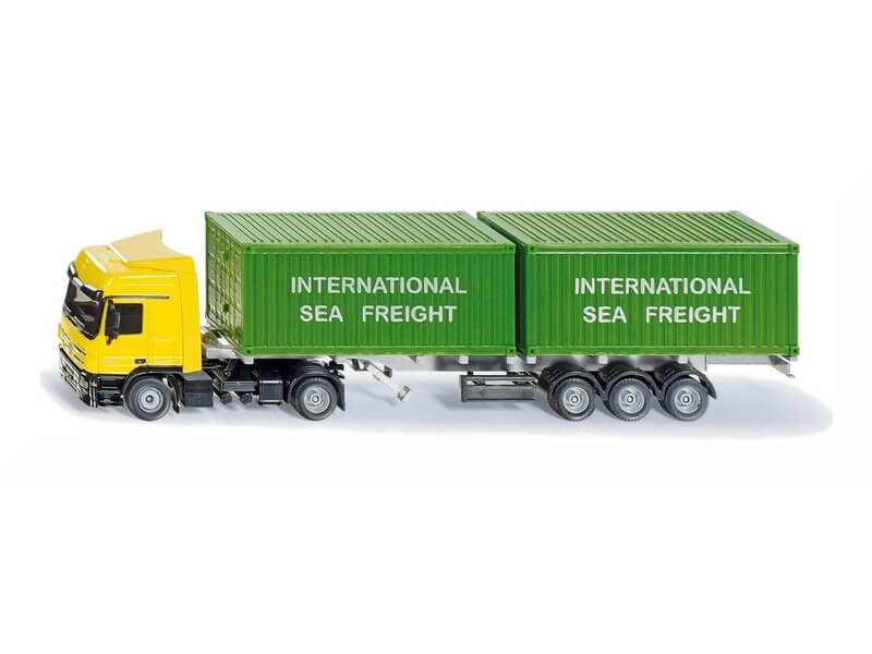 Szállíts rengeteg árut a Mercedes-Benz kamionnal! Az 1:50 méretaránnyal készült Siku: Mercedes-Benz Actros 2048 konténeres kamion egy nagyobb méretű, fém és műanyag vontató, konténerszállító utánfutóval. A kamionon egyszerre két konténert is tudsz szállítani, amiket tele tudsz pakolni mindenféle áruval, az utánfutó egy mozdulattal lecsatolható a vontatóautóról. A kamion együtt használható más 1:50 méretarányú SIKU autókkal, játékkészletekkel is. A Siku: Mercedes-Benz Actros 2048 konténeres kamion mérete: 31 cm.
