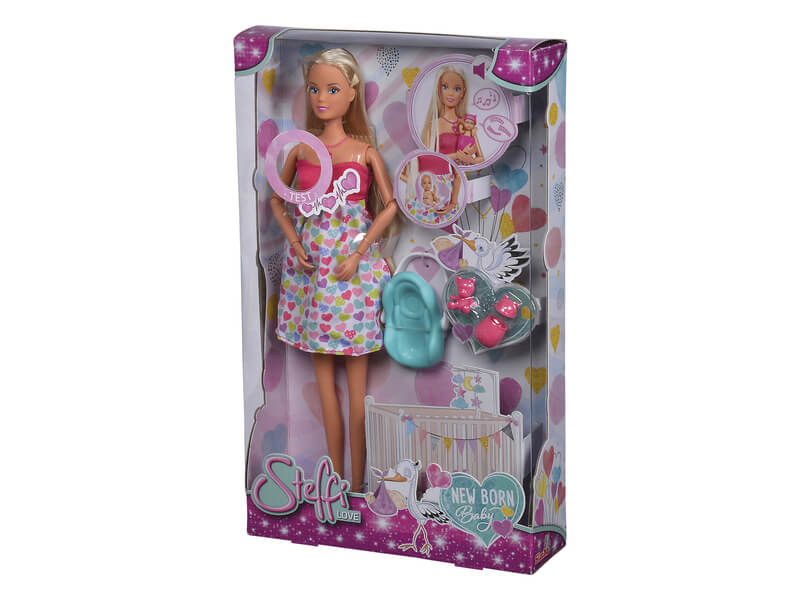 Steffi babát vár, a baba hangfunkciói jó szórakozást nyújtanak majd. Hallgathatjuk egy születendő baba szívverését, sírását, kacagását, altatódalt, ha megnyomjuk a szív alakú baba nyakláncot. A baba születéséhez Steffi hasa kipattintható, kivehető belőle a baba, majd átfordítható, hogy újra lapos legyen a hasa. A baba könyökben és csuklójában hajlítható karokkal rendelkezik, babahordozó és újszülött baba gondozásához szükséges kiegészítők vannak felszerelve. Try-me funkcióval rendelkezik. Kiegészítők: babahordozó, játékmaci, ruha, születési anyakönyvi kivonat A doboz mérete: 20x6x32,5 cm A játék 2 db LR44-es elemmel működik, amit a csomag tartalmaz.