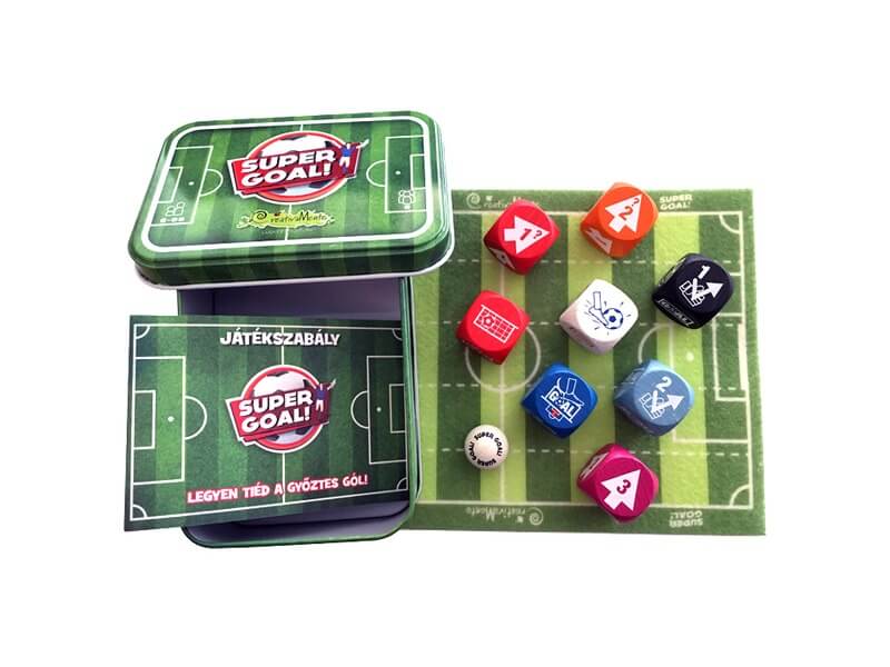 A doboz tartalma: 1 focipálya alakú játékpálya 8 óriási, színes fa dobókocka 1 fából készült golyó 1 játékszabály.