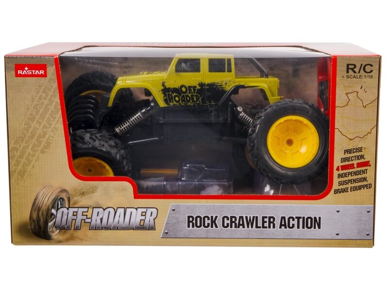 Nagy méretű terepjáró, hatalmas kerekekkel és távirányítóval! Az 1:18 méretarányú Rastar Távirányítós Rock Crawler Action egy műanyag karosszériával készült terepjáró autó, rugós felfüggesztéssel. A terepjáró minden irányba tud haladni, a villanymotor minden kereket meghajt, az autó a legnehezebb terepviszonyokat is könnyen veszi! A Távirányítós Rock Crawler Action távirányítója kormány alakú, a távirányító 1 db 9V-os elemmel, az autó 6 db AA ceruzaelemmel működik, a csomagolás csak a ceruzaelemeket tartalmazza. Méretek: 32 x 21 x 15 cm. A játékok külön kaphatóak. A megjegyzésben kérjük tüntesd fel, hogy melyik változatot szeretnéd!