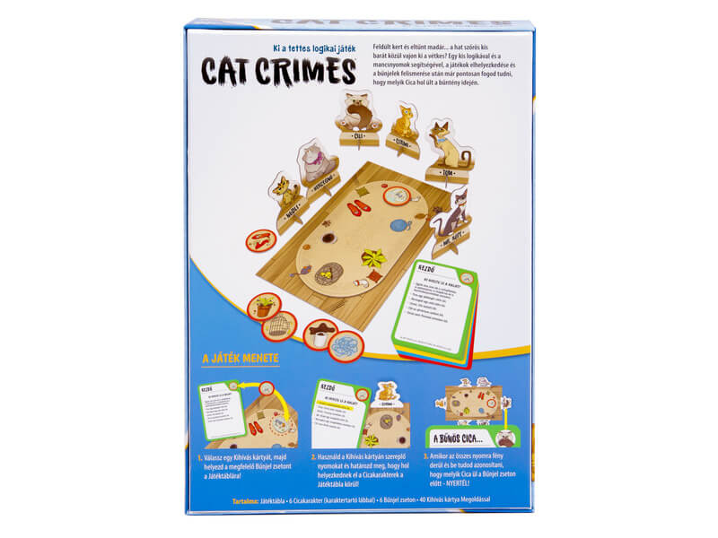 Ki öntötte ki a kávét? És ki törte össze a kaspót? 40 rejtélyes cica bűntény vár rátok. Kitaláljátok mikor melyik cica volt az elkövető? Húzzatok egy kihívás kártyát, kövessétek a nyomokat, értelmezzétek a bűnjeleket és ha biztosan tudjátok, hogy ki volt az elkövető, tiétek a győzelem. A kedves kis logikai társasjátékot akár egyedül is játszhatjátok, de sokan is csatlakozhatnak (6 készletbe 6 cica karakter van). Egy igazán szórakoztató családi társasjáték vár rátok egyre nehezebb feladványokkal, hogy a nagyobbak se maradjanak izgalmas kihívások nélkül. Készen álltok a nyomozásra? Cicás kalandra fel! Ideális ajándék azoknak akik szeretik a társasjátékokat, na és persze a cicákat. Ez a kártyajáték lehetőséget ad a koncentrációra, a figyelemre, a logikai összefüggések keresésére, és mindezt igazán szórakoztató formában.