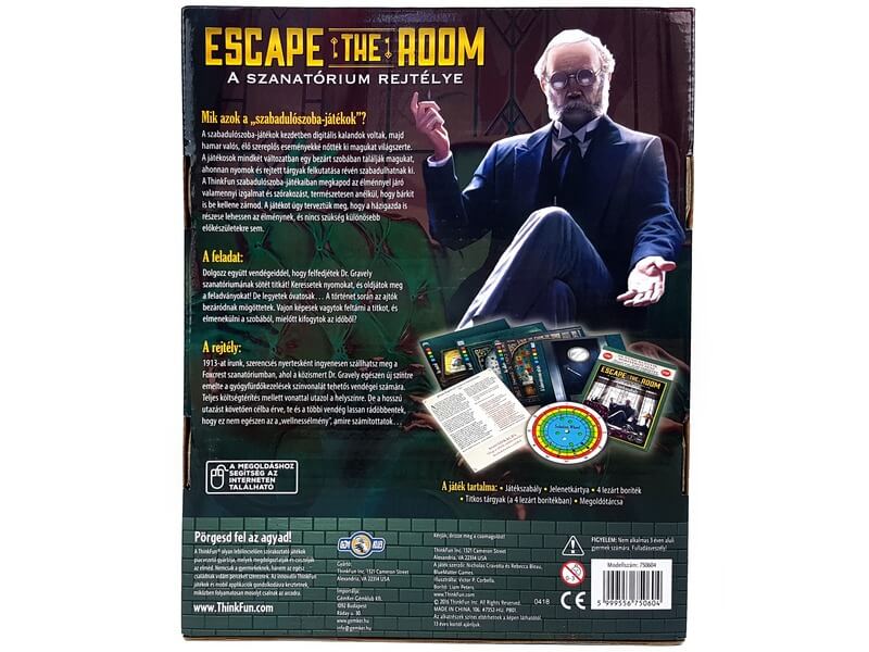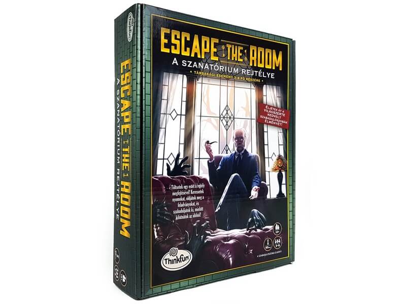 Szabaduló szoba játék, ahol fel kell fedni a szanatórium sötét titkát! Az Escape Room A sza-natórium rejtélye társasjáték egy kooperatív kijutás játék, ami 1913-ban játszódik. A Foxcrest szanatóriumban ingyenesen szállhatsz meg, a közismert Dr. Gravely gyógyfürdő kezelést biz-tosít a vendégeknek. Vonattal utaztok a helyszínre, ahol viszont rögtön kiderül, hogy ez nem egy megszokott wellness élmény lesz, amire számítottatok. Oldjátok meg a fejtörőket, figyel-jetek a bezáródó ajtókra, és jussatok ki a szobából, mielőtt lejár az idő!