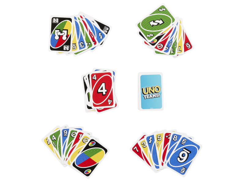 Az UNO Teams megduplázza a klasszikus UNO izgalmait. A cél nem változott, a játékosok még mindig színre-színt, számra-számot vagy szimbólumot rakhatnak, de ahelyett, hogy mindenki a saját győzelméért küzdene, párokban játszanak a győzelemért. A speciális kártyák és szabályok segítik a csapattársakat az együttműködésben, és a győzelemhez mindkét játékosnak meg kell szabadulnia a kezében lévő összes kártyától és persze az utolsó kártyához érve nem szabad elfelejteni azt kiáltani, hogy UNO!